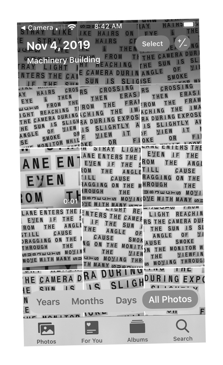 Devoid of the original context and taking on a poetic form, the repurposed phrases turn on the device posing questions about the medium of photography itself — how do we frame? Who and what can be captured and by what means? What tries to escape, can’t be seen, refuses or is present but invisible? Ripe with transitory visual elements such as condensation, motion blur, and the touch of a human hand, our attention is directed to the surface, production, and authorship of the image. In this field, subject positions, subjectivities, and the movement of the two in and out of the frame challenge notions of representation.