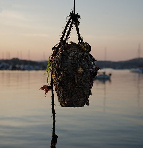 Several large sculptures are on view in the exhibition, including a sculpture made from the mast of Rogan's boat (where he has lived for the past four years) with an urn-shaped pot covered in aquatic life balanced on top. The urn had been suspended under the boat for one and a half years where it became colonized by sea life. Its new position on top of the twenty-foot mast physically elevates something that arrived from dark, murky depths and is a gesture intended to be considered formally as well as metaphorically.