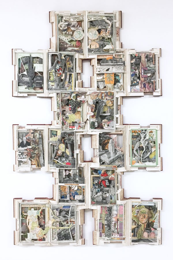 The book and the internet flatten both time and space. Information and ideas are collected and compressed, allowing attitudes and styles from any era to become instantly available to the present. Dettmer's sculptural interventions reflect this condensing of time, transforming into forms both primitive and modern. They are modern machines but also ancient fetishes. Greco-Roman architecture, Victorian imagery, Baroque ornamentation, Mid-Century Modernism, Dadaist collage, Pop graphics and Indigenous forms or art from the Americas, Africa and the Pacific islands are all reflected within the work through a newly negated hierarchy, providing new objects that are both iconoclastic and archival. They stand as monuments to the objectivity of truth. They become a more direct experience than the narratives hidden within. A compression and an expansion, they are timeless by being full of time.