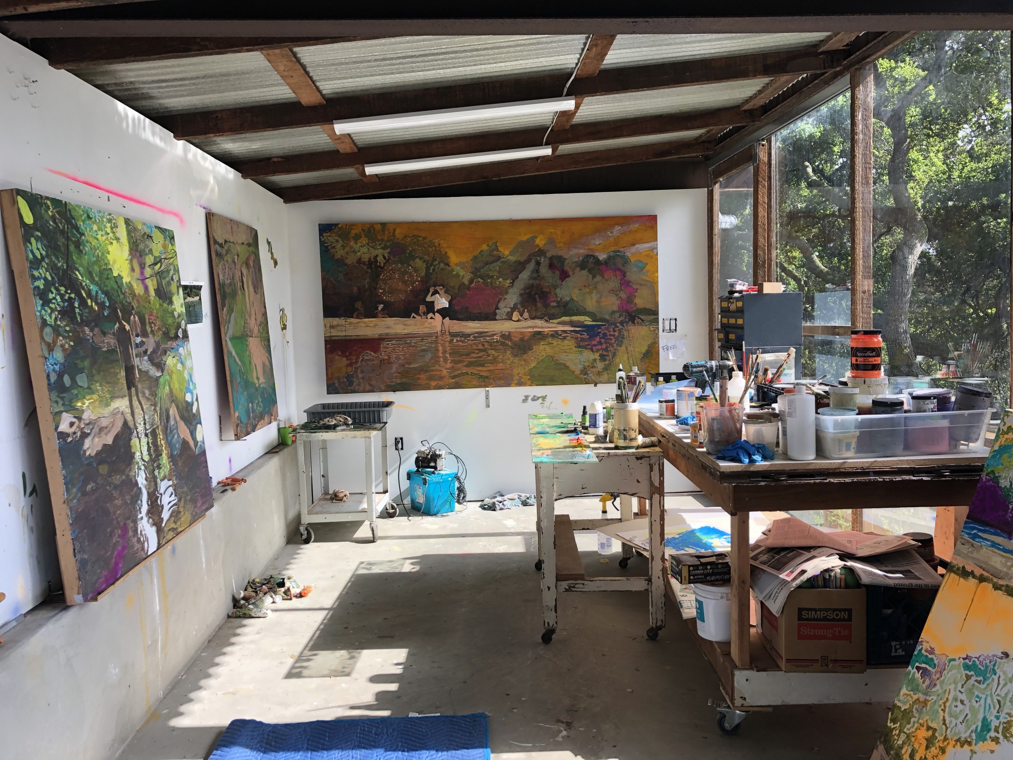 This is not just a pictorial investigation—Bennett’s body of work around the intersection of water, nature, and human experience extends to outdoor showers, saunas, and composting toilets in the natural environment. This part of his practice extends back to an exhibition in 2014 at BAMPFA where Bennett installed a pair of outdoor showers in the courtyard of the museum, open to the public as part of The Possible, organized by David Wilson. His study of ways to mechanically harness natural forces overlaps with his interest in architecture, and he has designed and built infrastructure supporting both temporary and long-term dwelling in nature. Whether structures for weekend-long group events or modest cabins for seasonal living, these projects express Bennett’s core motivations to promote communion with nature. These skills lend themselves to this show in that the artist spent the fall building a new studio as a means to produce these works. The studio is nestled under the deck of his home in the Oakland Hills (designed and lived in by Case Study architect Beverly Thorne), overlooking the bay and butted up against Redwood Regional Park, where Bennett can be at home with nature and still be an active member of the Bay Area community.