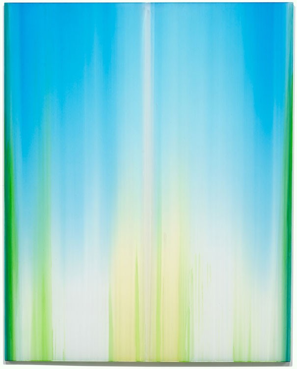 As art writer Richard Speer says, “You could build a new religion around Gregg Renfrow‘s artwork. His abstract compositions–polymer and pigment poured onto cast-acrylic panels–are so luminous and elemental, they inspire a reverence normally reserved for deities. Each piece features a central motif roughly the shape of a rectangle, surrounded by shapes that echo its contours… There’s something mystical or psychedelic about the echoing shapes as well; they radiate like tracers, expanding in a way that suggests vibration or movement… Looking at Renfrow‘s panels, it’s impossible not to imagine what they would look like lining a cathedral, like stained glass.”