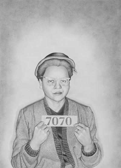 “We might start with the striking visibility of Thomas’ fine line work—intentional, deliberate—which renders these women as highly regarded sitters rather than mechanically-reproduced subjects of the state. The purposeful clarity of each hair, each coat thread, each worry line, functions here as a steady etching of history that needs to be carefully attended to. Further exceeding her source material, Thomas has accentuated eyes and hands, underscored a smirk or a side eye. The large-scale portraits, many times the size of a mugshot, are meant to be displayed so that our eyes look directly into theirs, a demand for mutual recognition.”