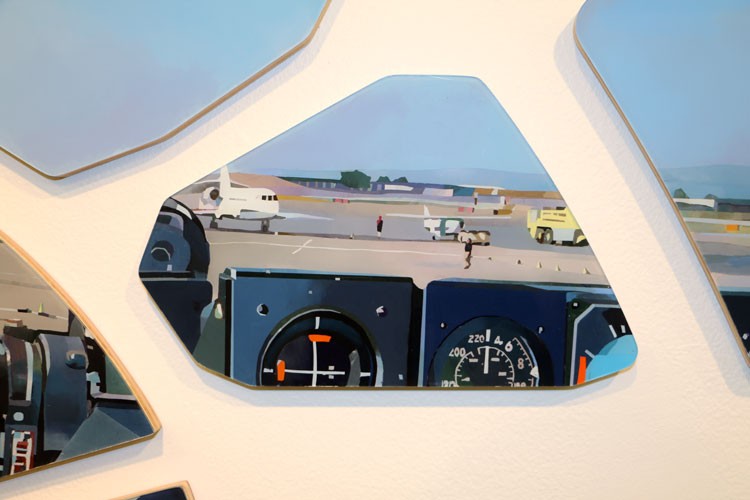 Central to both exhibitions is Training Setting, an installation of 26 shaped paintings which depicts parts of a cockpit along with a contemporary airfield as seen through the windscreen of a grounded B-29. The iconic bomber of WW2 and the start of the Cold War, the B-29 heralded a new era of globalization in which territory would increasingly be defined by targeting. The windscreen is rendered as a diagram that cuts through both an interior and exterior view, circumscribing a visual manifold encompassing flight instrumentation, ground equipment and crew, airfield and landscape. The curvature of the horizon across the peripheral field frames an oculus with an inactive Norden bombsight at its center. The work describes an environment alive with interconnected protocols, from attitude displays to taxi patterns, but also neutralized: a view of the twenty-first century from the perspective of an decommissioned twentieth century plane. The paintings are reverse-painted on transparent sheets of Plexiglas and mounted on plywood panels. Encased between wood and Plexiglas, the images occupy a space between painting and diagram, where they are interrupted continuously across the visual field.