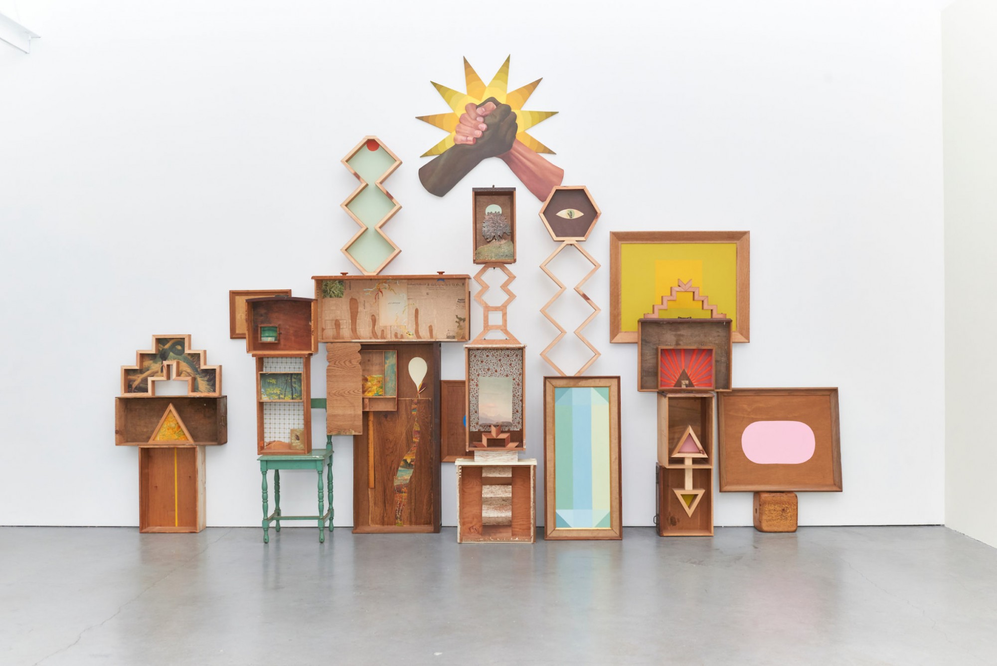 Pebworth’s “Handshake Paintings” are exhibited above her sculptural “totems”. The wooden sculptures link with the painting as they are all carry embedded histories and stories with them, whether as graphic tools used to connect people (strangers) or discards from the San Francisco dump which are imprinted with the lives of others and transformed into reverential totems. Pebworth’s works are all explorations into alternative forms of storytelling.