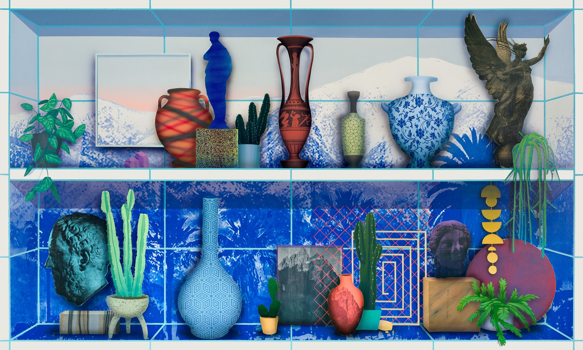 In these works, screen printed California cityscapes and landscapes are backdrops to arrangements of stenciled classical Roman sculptures, cacti and succulents, Etruscan urns, and Egyptian figurines, all placed on shelves inside tiled vitrines. It is a proposition that both honors and disrupts traditions of still-life and landscape painting: are these objects relics of the past, objects of the present, or possibilities of the future? Are the vitrines transparent, or tiled with photo decals? A sense of dislocation and disorientation begins to seep in as forms and landscapes are repeated throughout the work, often silhouetted to further disassociate from their real-world counterparts. These objects are disconnected from any cultural significance, reminiscent of a Cabinet of curiosity, and Minervini's natural spaces are only facsimiles of nature. This constructed world is as familiar as it is foreign.